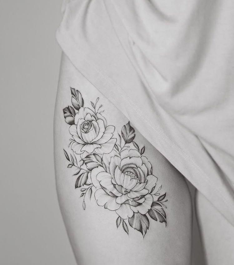 Размер бедра также позволяет вам экспериментировать с более крупными татуировками, на которых больше деталей — идеальный холст для татуировки пиона.