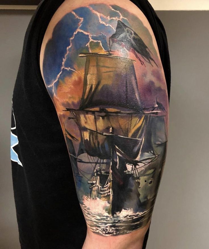 2. Тату в виде корабля — еще один вариант татуировки на пиратскую тематику.