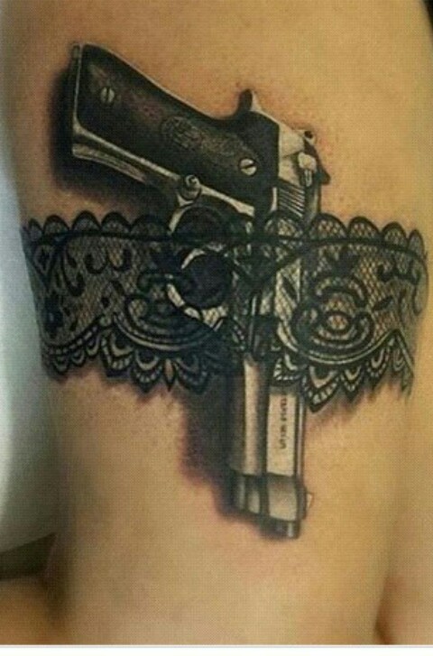 Мужские тату пистолет чаще всего выполняются в черно-белой гамме, но это не стоит воспринимать как правило. У девушек часто можно увидеть тату пистолет на бедре вместе с изображением подвязки. Попадаются работы, которые выглядят настолько реалистично, что может показаться, будто пистолет и подвязка настоящие. В такой татуировке женственность переплетается с опасностью, сила с нежностью, решительность с кокетством.