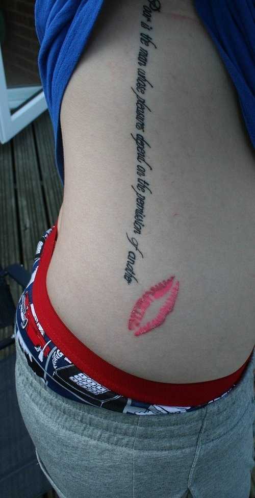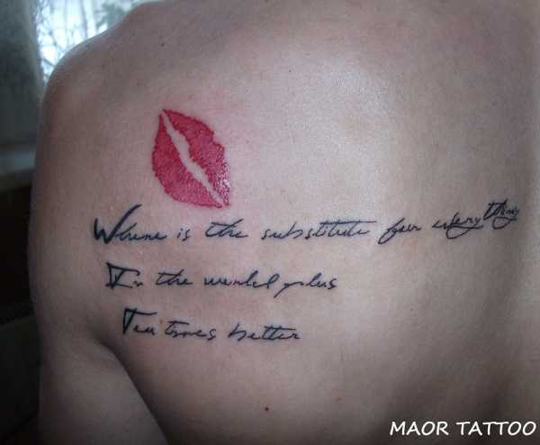 Татуировка губы не обязательно подразумевает набивку картинки. К популярным нагубным надписям относятся: «Kiss me», «Love», «VEGAN» или «rock and roll». Но особое умиление вызывают люди, решившие носить на губе слово «кофе» или «зомби», а может быть даже «непоколебимый». Популярны парные татуировки с именами любимых.
