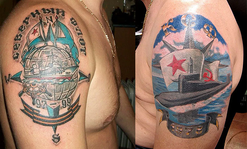 Для служивших на субмаринах, судно становится символичным. Поэтому именно подводную лодку предпочитают накалывать многие мужчины, выбирая при этом реалистичное изображение. В частых случаях субмарину изображают всплывшей на поверхность морской глади.