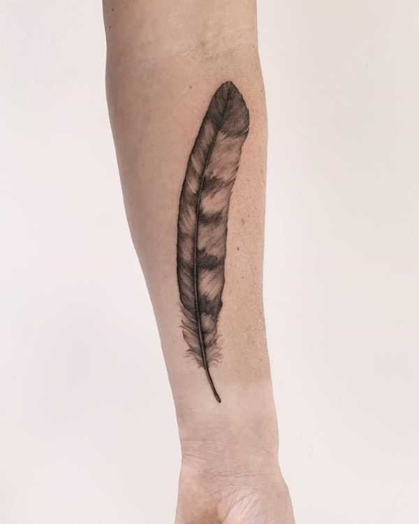 Перо птицы — это довольно интересный и многозначительный предмет. И такие тату весьма и весьма популярны. Они могут быть символом загадочности, мудрости и терпения. татуировка пера говорит что ее носитель личность довольно смелая и яркая.