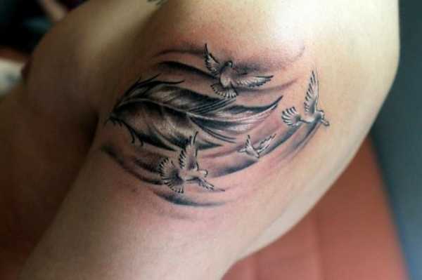 Тату перо с птицами. Значение этого рисунка – свобода, независимость и сила духа. На сегодняшний день, это один из востребованных эскизов для девушек.