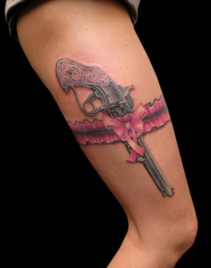 Комбинация ленты и пистолета уникальна и любима молодыми любителями татуировки.