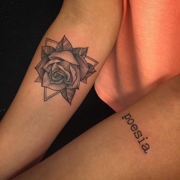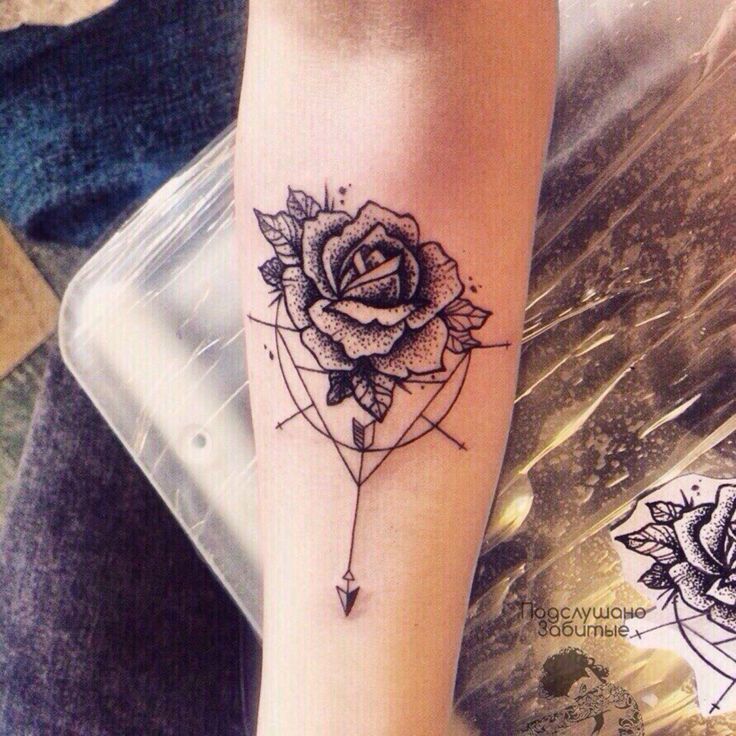 Очень распространенное изображение среди девушек. Такую татуировку бьют в стиле графика, акварель или минимализм, а цветы выбирая в зависимости от предпочтений обладателя тату или исходя из значения цветов. Ни для кого не секрет, что тату роза в треугольнике – главный фаворит и не только среди слабого пола, но и среди мужчин. Последние любят разноцветные эскизы в стиле нью и олд скул.
