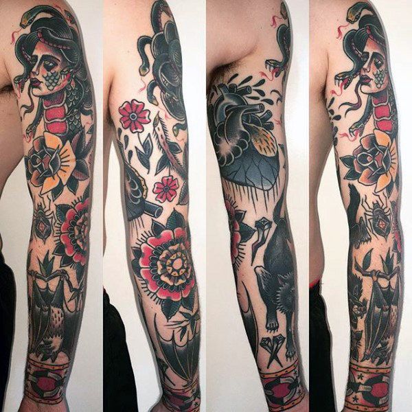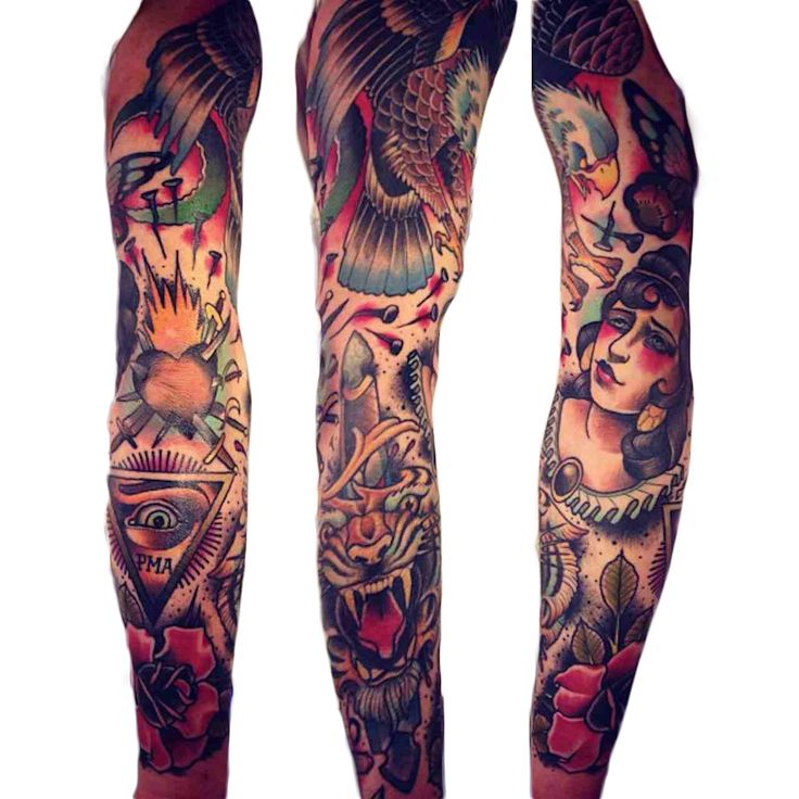 Для истинных ценителей можно порекомендовать композицию в стиле олдскул тату «рукав» – изображение, что наносится от плеча до кисти и занимает всю поверхность кожи руки.
