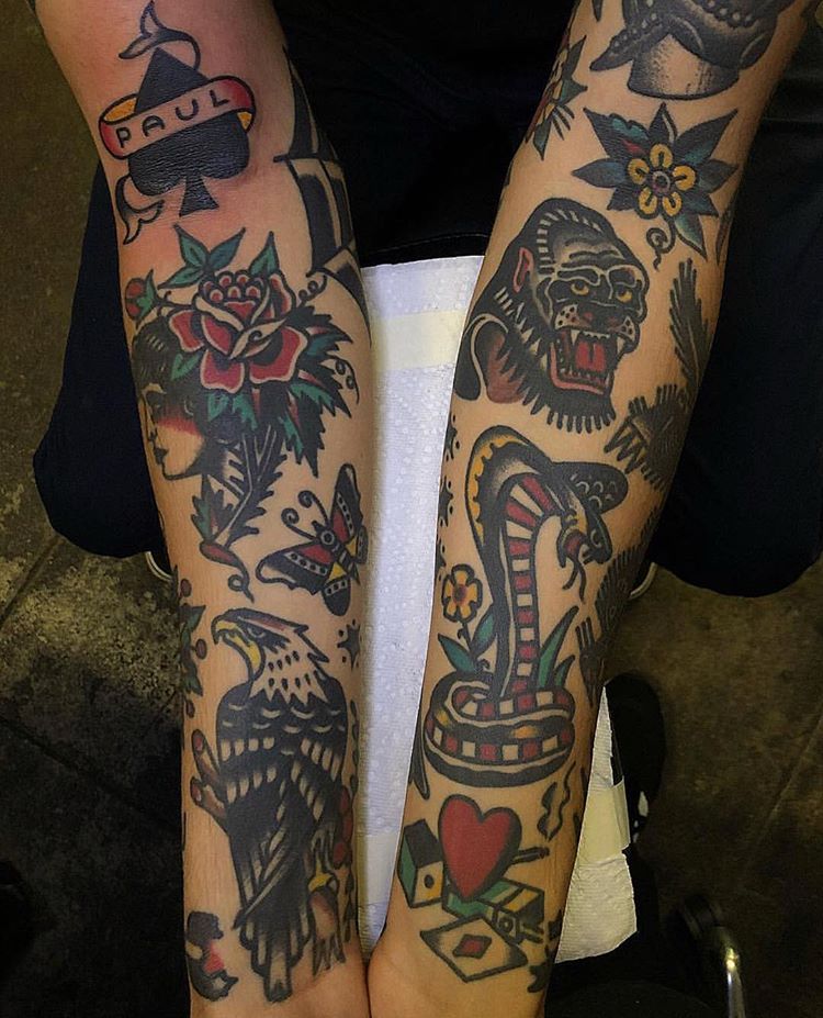 Часто на предплечье у мужчин изображен феникс в олд скул тату. Загадочный символ огня, страсти и бессмертия, воссоздающий сам себя из праха. О характере владельца такой татуировки можно сказать одно — это энергичный человек, не знающий страха поражения. Такой символ сделает жизнь своего хозяина ярче, пламеннее.