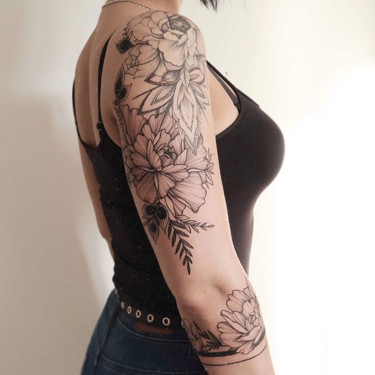 Удивительная татуировка с абстрактными цветами на левой половине рукава девушки.