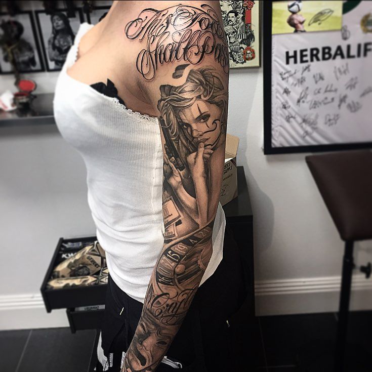 Тату рукав на девушке в стиле Чикано ничем не отличается от мужских. Те же атрибуты стиля: рулетки, карты, деньги, надписи, короны, розы и обязательный персонаж в районе плеча – девушка с раскрашенным лицом в знак принадлежности к уличной банде.