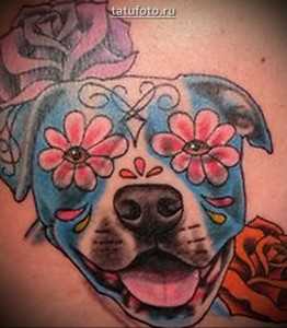 Несмотря на то, что татуировки с бойцовским псом делают представители мужского пола, встречаются и девушки с подобными рисунками на теле. Обычно представительницы прекрасной половины человечества выбирают милые “мультяшные” изображения собаки или портреты любимых питомцев, украшенные цветами, они не несут в себе агрессии. Значение тату “питбуль” у девушки – веселый характер, любовь к животным.