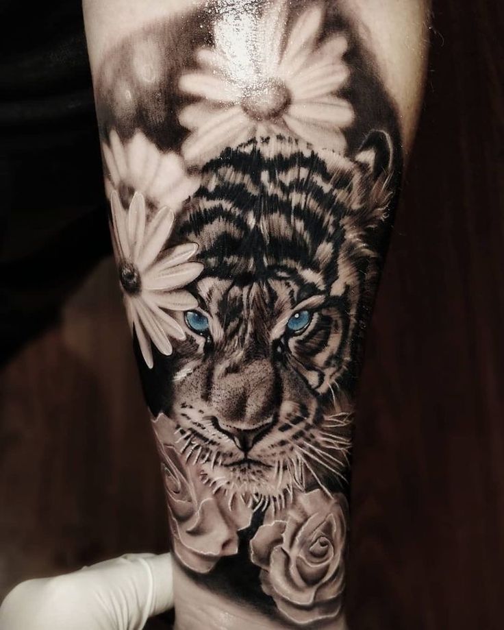 Тату тигра с цветами для девушки станет отражением ее нежности и преданности семье.