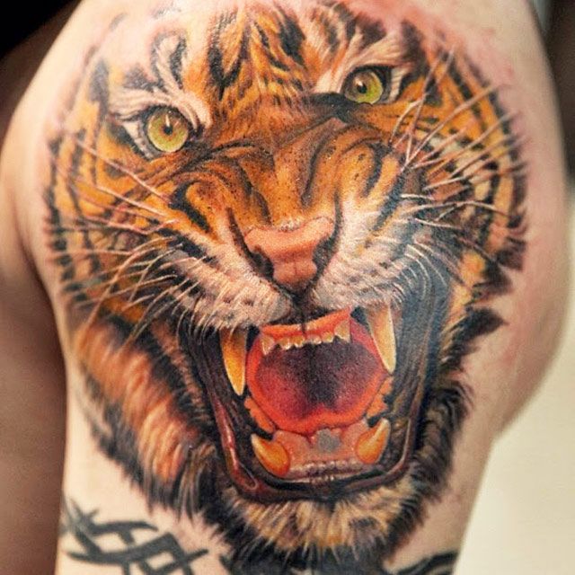 Один из популярных сюжетов тату тигра для мужчин это оскал. Значение тату оскал тигра позволяет узнать многое о характере владельца. Она может обозначать вспыльчивый характер, желание выделиться из толпы, отражение внутреннего гнева и ярости.