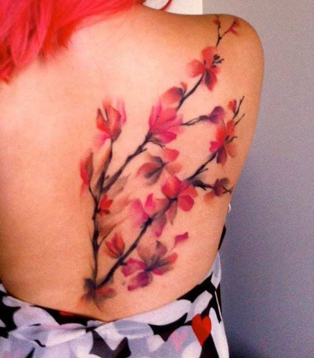- Акварельные татуировки — акварельный стиль татуировки имитирует внешний вид картин с использованием ярких цветов, но светлых, как будто местами слегка разбавленных и перетекающих друг в друга. В рисунках сакуры они могут быть полностью выполнены этим шрифтом или иметь сплошные очертания для дополнительного эффекта.