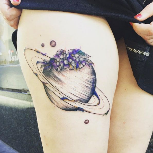 Акварельная татуировка Сатурна кажется одним из самых популярных и забавных способов сделать татуировку этой планеты. Акварельный стиль идеально подходит для создания татуировки, символизирующей космос и солнечную систему. Поскольку пространство не имеет границ, акварельный стиль идеален, потому что его определяет правило отсутствия сплошного контура. Подобно акварельной живописи, этот стиль течет и смешивает цвета, придавая ему причудливый и загадочный вид. «Таинственный» определяет пространство, на наш взгляд, поэтому татуировка Сатурна в этом стиле очень актуальна.