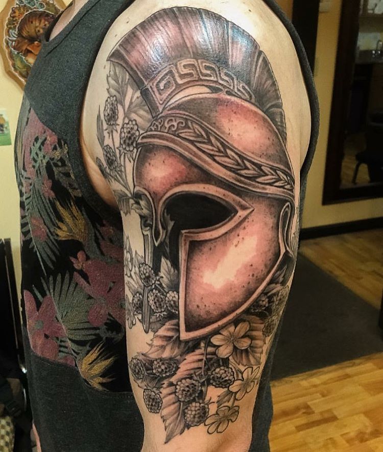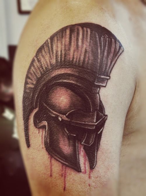 Трехмерная татуировка шлема воина на левом плече мужчины Спартанский шлем