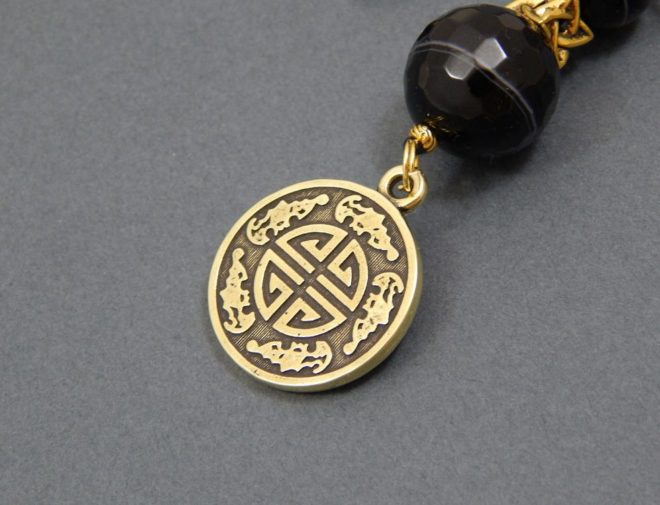 В центре амулета находится изображение летучей мыши, вокруг которой располагаются знаки. Летучая мышь в Китае – это душа, которая достигла равновесия и обрела в реальной жизни все пять благ.