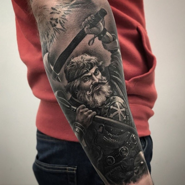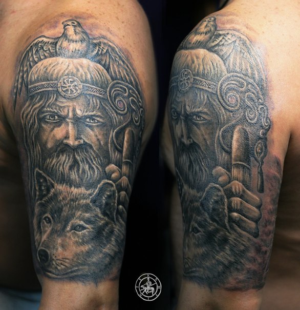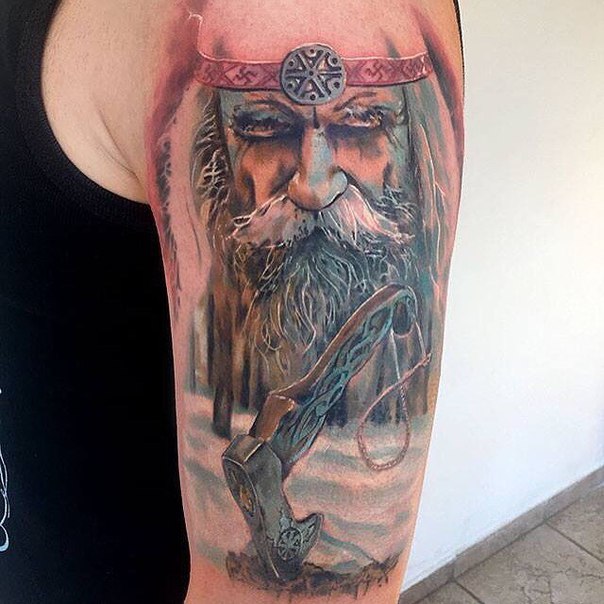 Языческая вера предполагала большой список божеств, которым поклонялись старообрядцы до появления христианства. Сейчас татуировки с ликами богов стилизуются под изображения сильных мужественных мужчин, похожих на типичных варягов. Такие картины отлично подойдут для парней плотного телосложения.