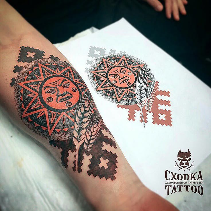 • тату обереги славян символы – схематичные рисунки часто ассоциировались с богами и несли в себе глубокое значение. Большая часть символов является солярными, то есть имеющими форму круга и посвященными солнцу. Это свастики с разным количеством спиц, вписанные в круг. Самый известный вариант – тату коловрат – солнечное колесо, которое помогает устранять любые проблемы;