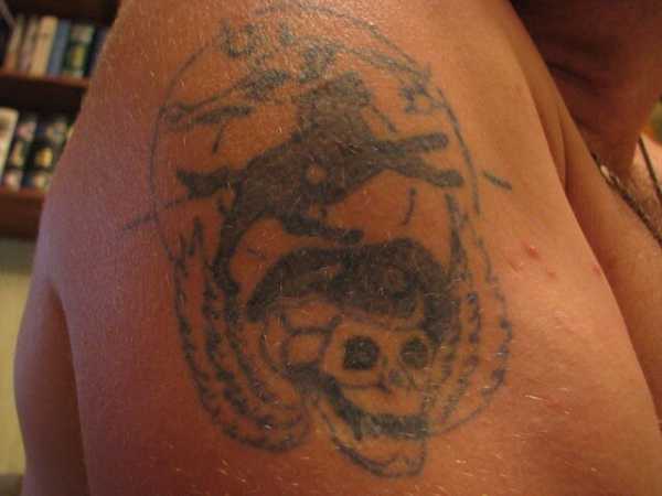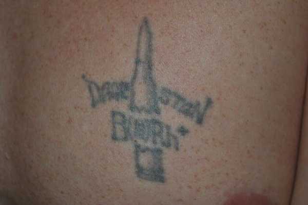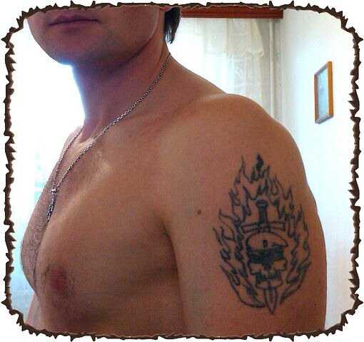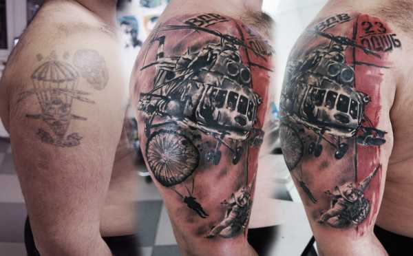 Очевидно, подобный рисунок на теле мужчины – это еще и памятный знак, связанный с важным событием в жизни человека. Бывший военнослужащий выбивает на теле не только сюжетную картину, образ или символ, но и наименование войск, длительность и место службы.