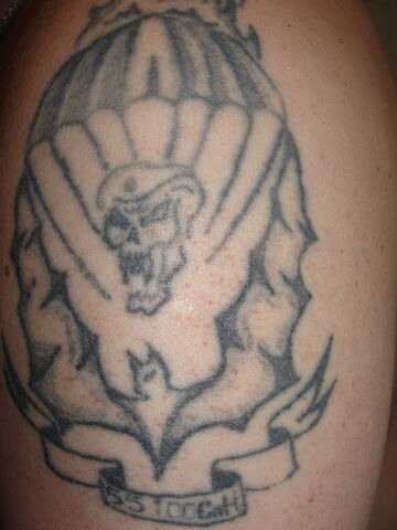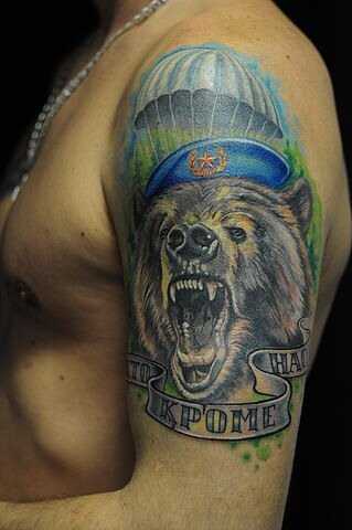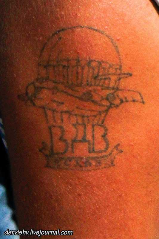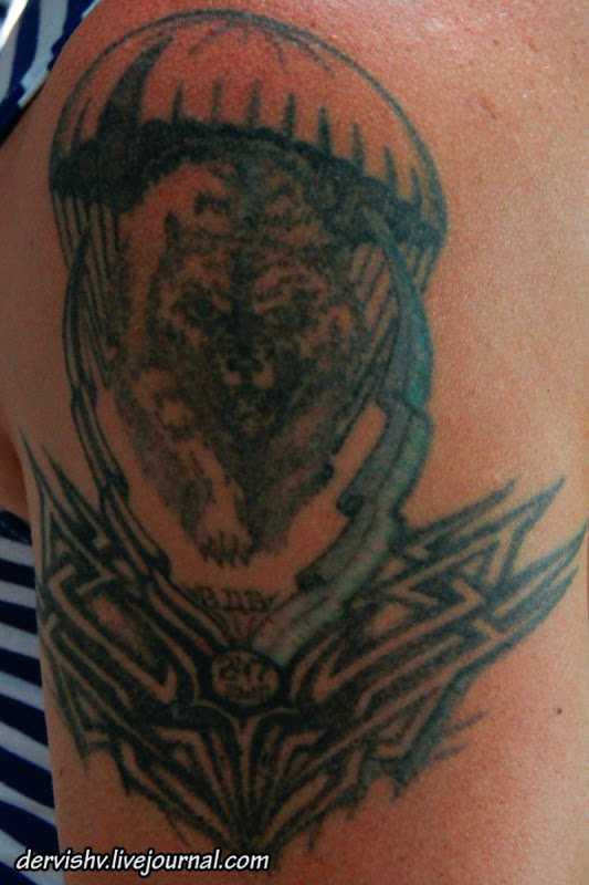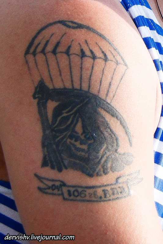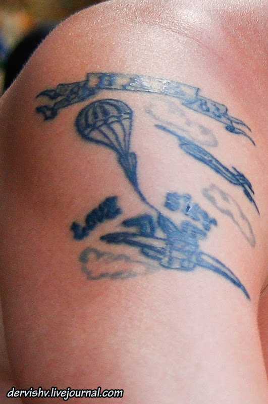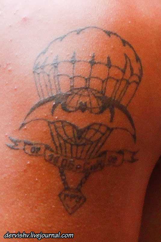 Здесь все просто, наколка делается на левом плече, на ней изображается парашют с крыльями бмдэшку, дополнительно указывается населенный пункт, под которым проходила служба. Иногда среди рисунок встречается крылатый меч с беретом на щите, а на втором плече эмблема ВДВ и еще крылатый волк, где написано «45 ОРП». Самым оригинальным рисунком является парашютист с раскрывающимся парашютом, а на фоне улетающий самолет. Стоит отметить, что среди бойцов ВДВ практически 100% по окончанию службы наносят татуировки.