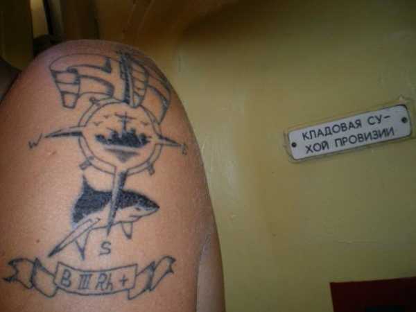 У северного флота символом является белый медведь на плече. У других представителей данного рода войск на наколках встречаются: штурвальное колесо, парусники, якорь или надпись на ребре ладони «За ВМФ!». Кстати, надпись делается именно на ребре ладони, потому что она будет видна, когда опрокидывается стакан водки в рот.