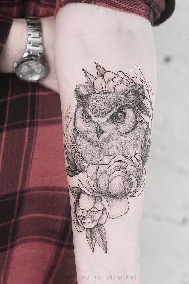 Eine Eule mit pflanzenblΓ€ttern und blΓΌten im art