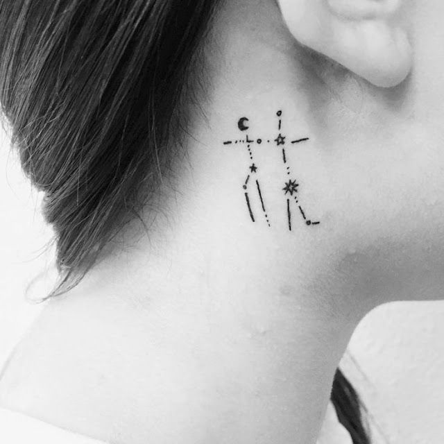 Небольшие тату с созвездием и символом Близнецов неплохо смотрятся на задней и боковой стороне шеи, на женской лодыжке.