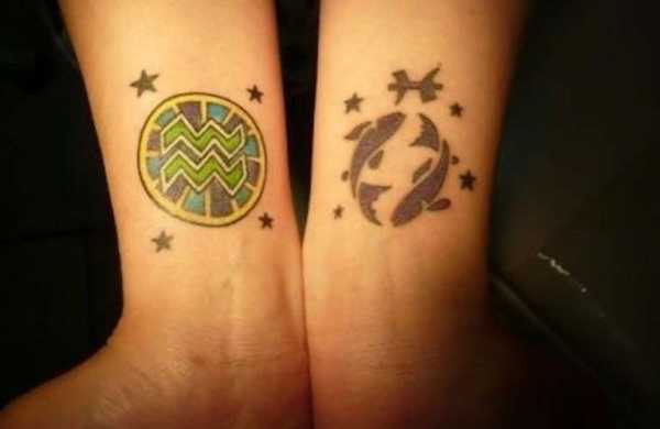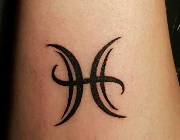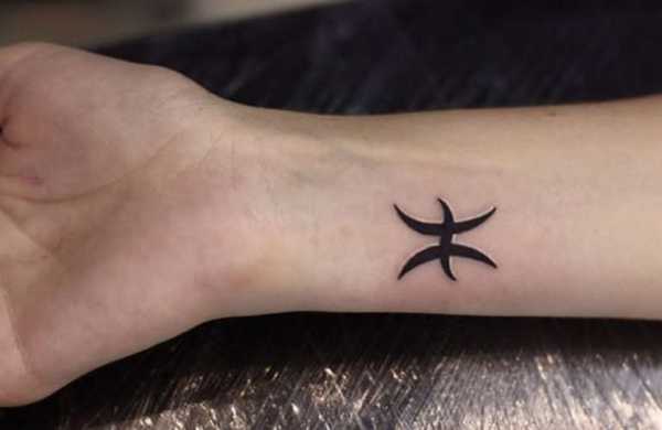 Татуировка со знаком зодиака «Рыбы». Рыбы обычно очень мечтательны и строят излишние планы, можно сказать, что они живут эмоцией, которую ощущают в данный момент. Тату поможет Рыбам смотреть на жизнь без призмы мечтаний, без потери счастья и покоя.