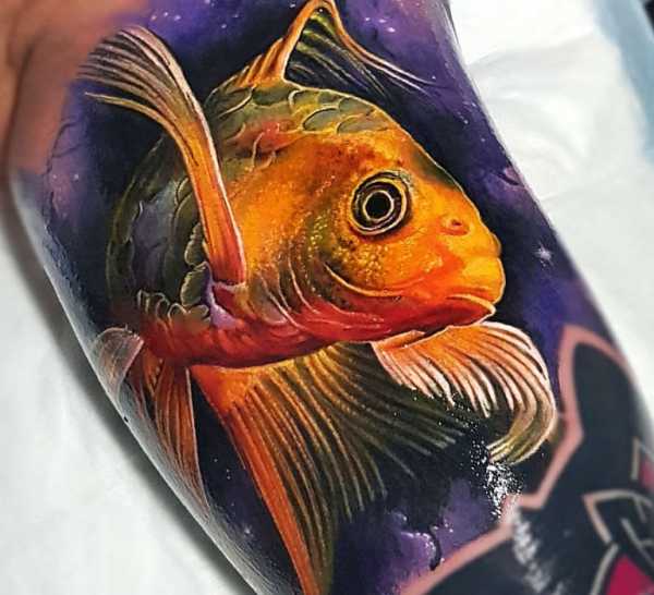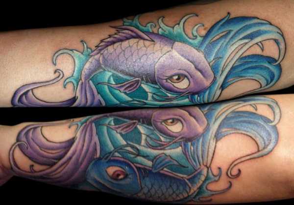 Сами по себе рыбы – достаточно популярный сюжет для татуировки. Человеку с таким знаком зодиака, не любящему схематичные иллюстрации, подойдет любое изображение этих представителей водного мира. Особенно удачный вариант – синие, фиолетовые, лиловые и зеленые рыбки, так как это цвета людей, рожденных в период влияния соответствующего созвездия.