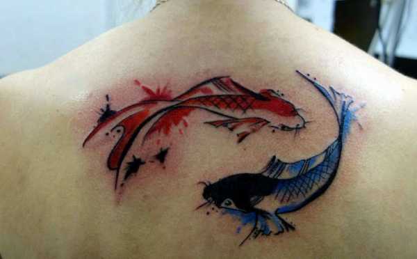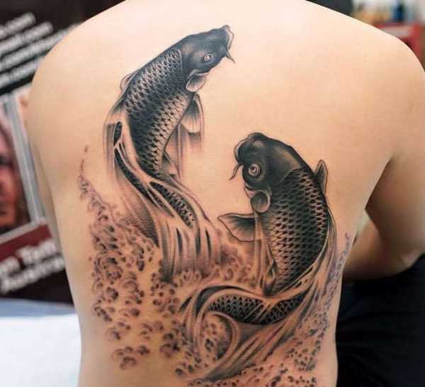 Частое решение татуировки с рыбами – рисунок на тему Инь и Ян. На таком эскизе изображены две кружащиеся друг за другом рыбы. К остальным значениям тату добавляются смыслы гармонии и единства мира.