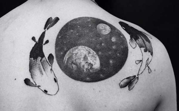 Чтобы добиться внутренней гармонии между разумом и эмоциями, необходимыми потребностями и прихотями, усмирить излишние амбиции, но не стать ленивым и безвольным человеком, мужчина может набить тату Рыб на лопатках или между ними.