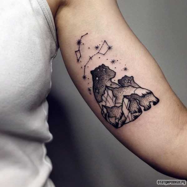 Татуировка в виде Большой Медведицы – данное изображение является знаком защиты Высшими силами. Человеку этот символ дарует счастье, и область удачи зависит от той области, где тату находится. К примеру, на руке (Близнецы) – обладателю везет с людьми, в общении.