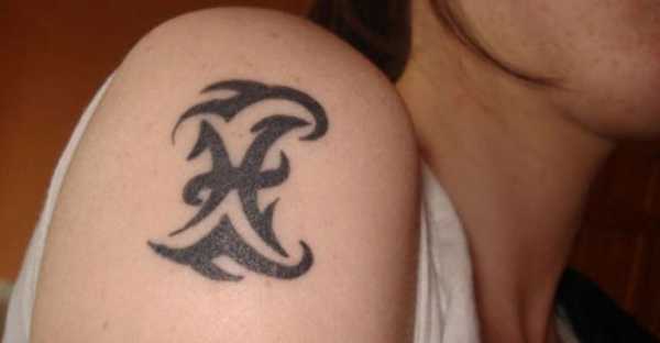 Этот знак очень похож на букву “Х”, но иногда тату созвездия Рыб можно увидеть в виде двух изогнутых рыбок, а в некоторых случаях – с перемычкой посередине. Если же знак сделать объемным, то его можно считать магическим.