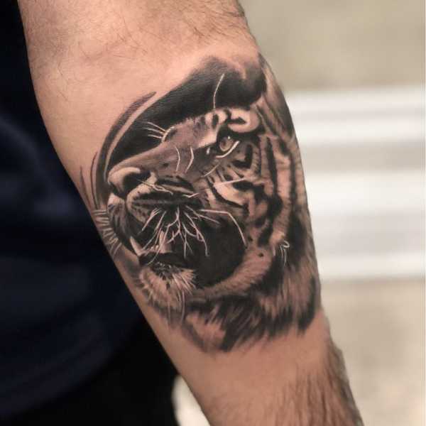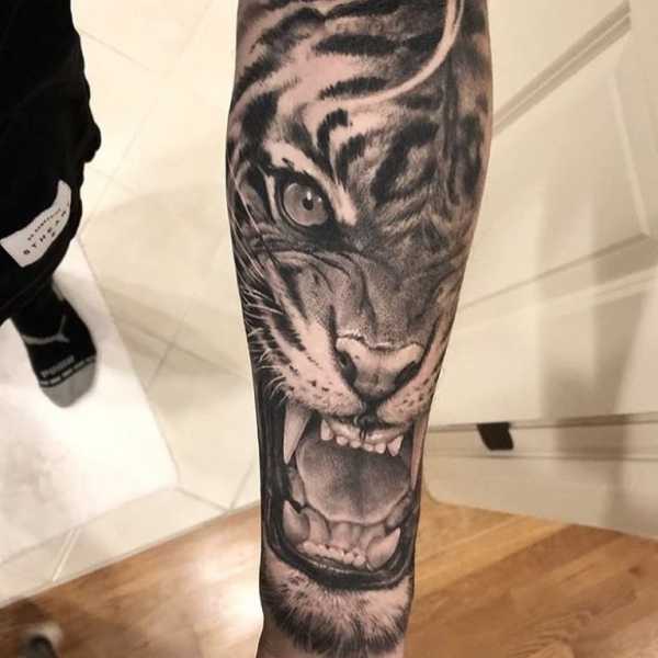 Тату может быть исполнена как в черно-серой гамме, так и в цвете. Тату тигра на плече или руке может иметь тысячи вариаций.
