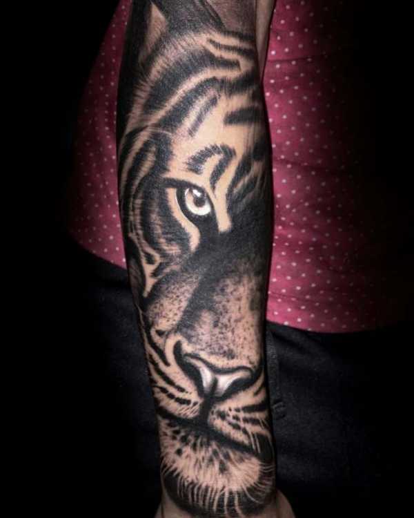 Тигр символизирует многочисленные явления. Этому зверю присущи две стороны: темная и светлая. К первой можно отнести кровожадность, великую мощь, агрессию и силу. Ко второй относится честь, доблесть, грация и мужественность. Все будет зависеть от конкретного эскиза и его расположения на теле, благодаря которому можно показать одну из своих сторон.