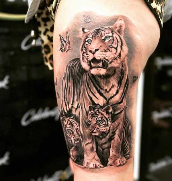 Неудивительно, что многие девушки в качестве эскиза для татуировки выбирают хищника-тигра. Это очень изящное и грациозное животное, привлекающее внимание красотой, ярким окрасом. Это животное поистине благородное, умное и сильное. Изображение хищника, нанесенное на тело девушки, имеет некие значения. Тату тигра в этом случае означает, что его хозяйка женственна и хитра, но в то же время властолюбива. Детеныш тигра считается символом нежности, материнства, сильной привязанности к своему ребенку. Именно такая татуировка очень популярна среди слабого пола.