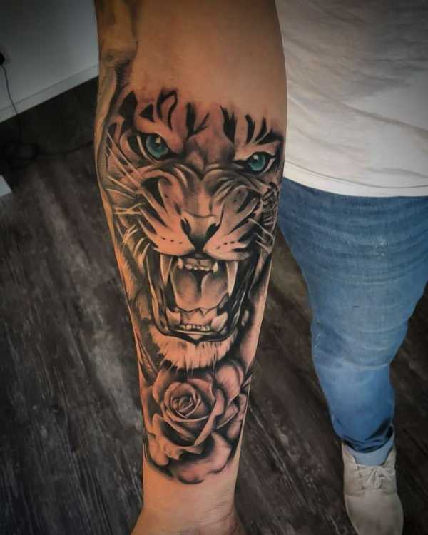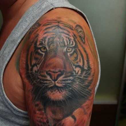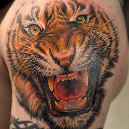 Чаще, чтобы заявить о своей власти, силе духа и характера тату тигра изображают на плече в реалистичном варианте. Запечатленный хищник в прыжке означает движение к победе, несмотря на преграды на пути. Хозяин такой татуировки не остановится на половине дороги к своей цели. Ему не будут страшны трудности и препятствия. Тигр с оскалом характеризует силу и озлобленность на власть. Данное изображение очень популярно в тюремной среде.