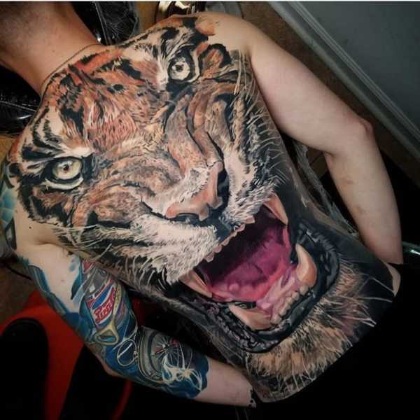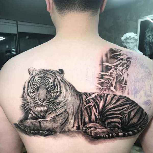 Мужчины предпочитают наносить на свое тело эскизы больших размеров. Тату тигра на спине, на груди и на плече, за счет обширных областей этих частей тела, будут смотреться наиболее эффектно.