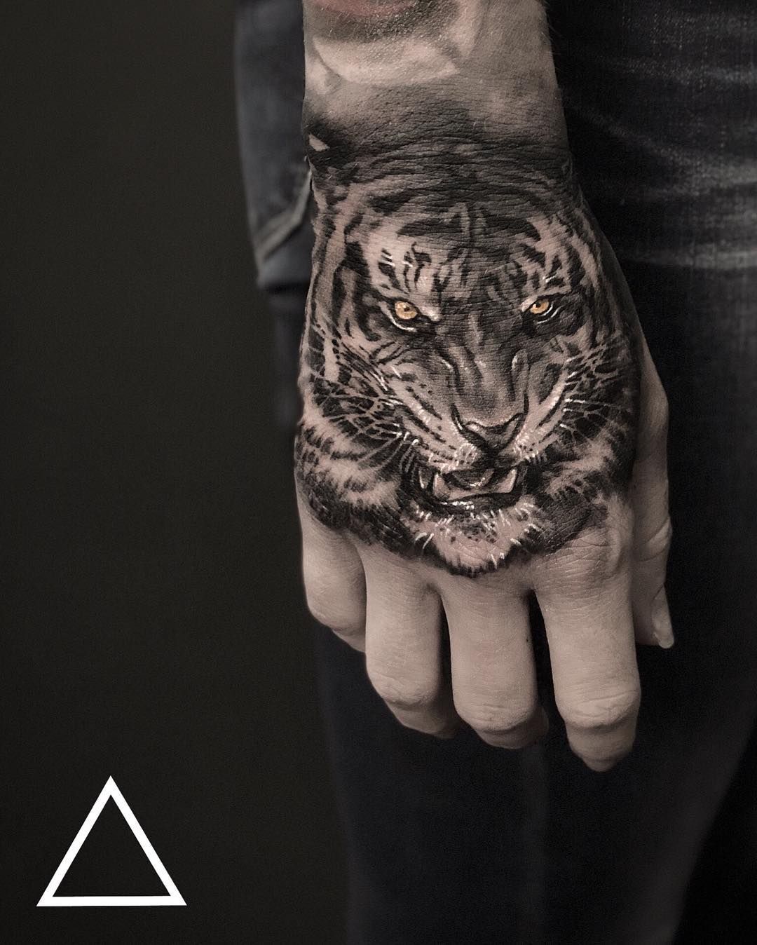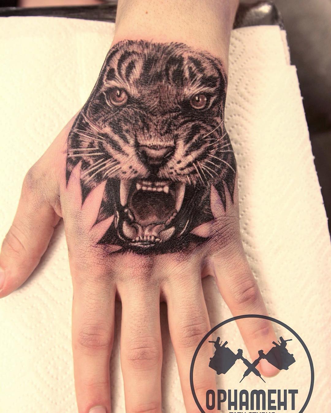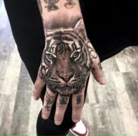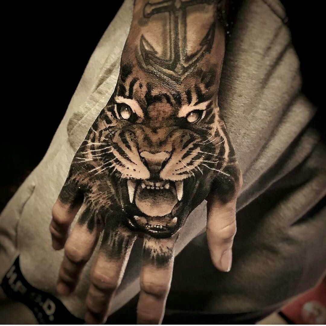 Эта татуировка идеально подходит, чтобы продемонстрировать свою мужественность. Он украшает верхнюю часть руки и суставы пальцев и представляет собой монохромное изображение тигра с едва видными клыками и пронзительными голубыми глазами. Это неуловимо, но имеет много символического значения.