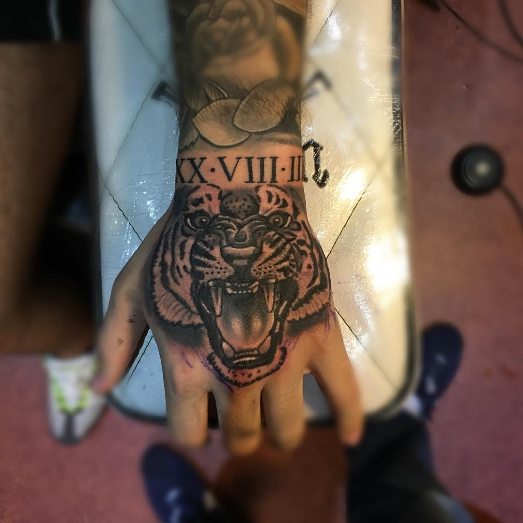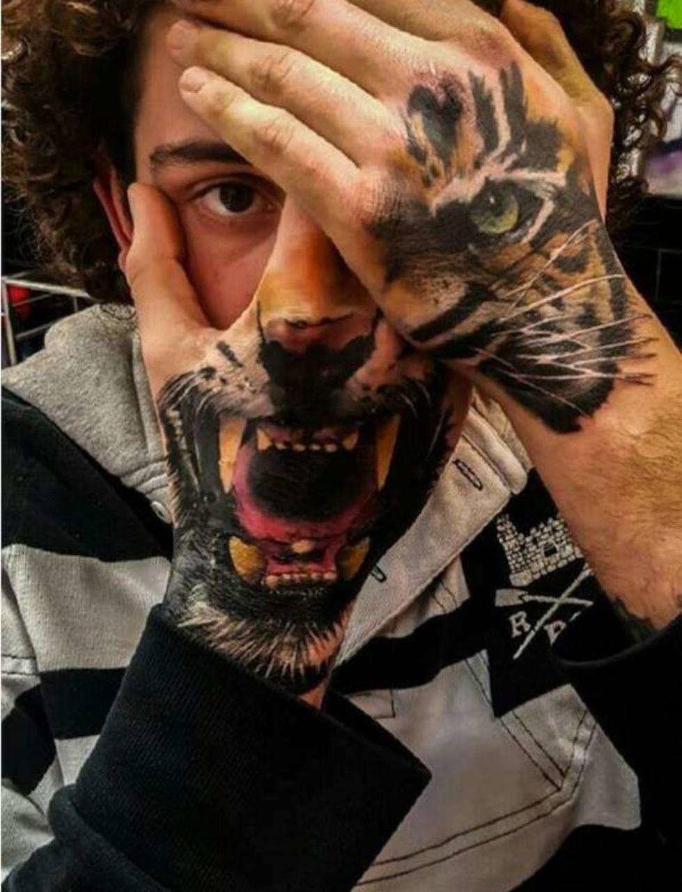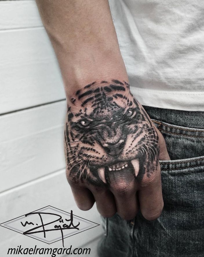 Эта татуировка идеально подходит, чтобы продемонстрировать свою мужественность. Он украшает верхнюю часть руки и суставы пальцев и представляет собой монохромное изображение тигра с едва видными клыками и пронзительными голубыми глазами. Это неуловимо, но имеет много символического значения.