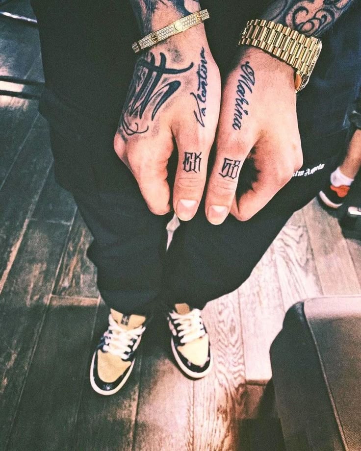 Так, на фалангах всех пальцев рук присутствуют символы денег, власти, богатства и роскоши, а также череп и цифра 13. Еще одна символическая татуировка расположилась чуть выше над пальцами — это фраза «Good luck». Одно из самых важных слов, а точнее, имен в жизни музыканта набито на большом пальце правой руки — это имя его матери «Симона».