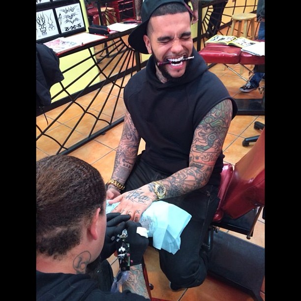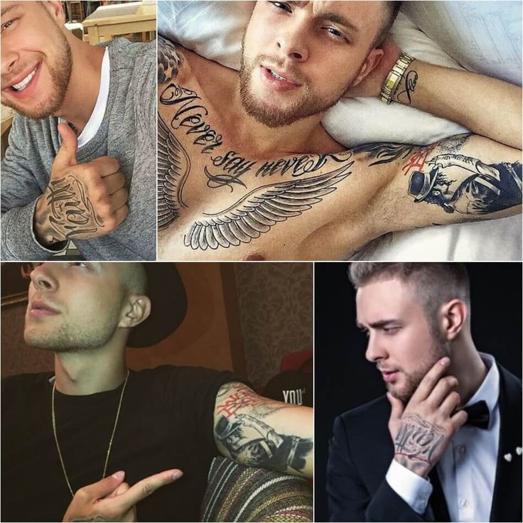 Они расположены по всему телу певца. Так, на животе у него набита дата его рождения – 1985. Сначала это были контуры цифр, но позже их украсила надпись: «Рожденный побеждать» и городской пейзаж.