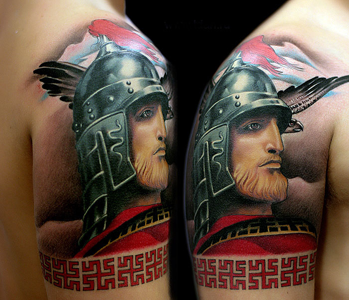 Эскиз такой татуировки может быть ограничен только вашей фантазией. Древнерусский воин может быть изображен в сопровождении дружины или в гордом одиночестве.