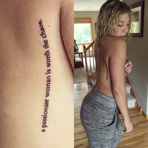 Цитаты в таких татуировках священных писаний для девушек кажутся довольно грубыми, но, безусловно, верны. Сильные линии написаны чернилами, а уверенные изгибы традиционным шрифтом выражают длинное предложение в четыре строки. В целом вертикальный рисунок хорошо сидит на лопатке.