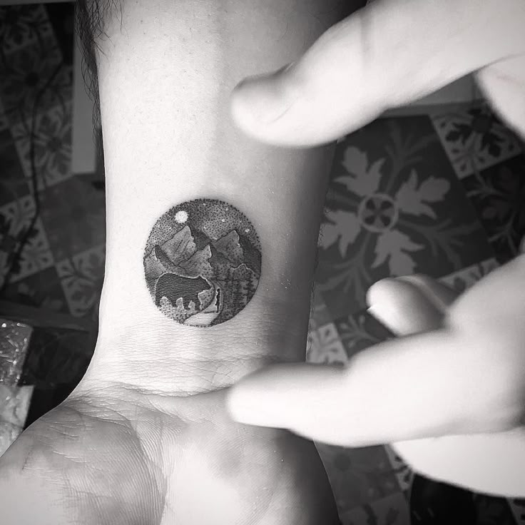 На этом дизайне изображены деревья, горы и звезды в круглой рамке, что очень модно в наши дни. Горы — это абстракции, состоящие из треугольников. Эту татуировку можно разместить на руке, ногах, спине и талии, но из-за детального дизайна ее будет сложно сделать на небольших местах, таких как за ухом, сбоку пальца или руки.