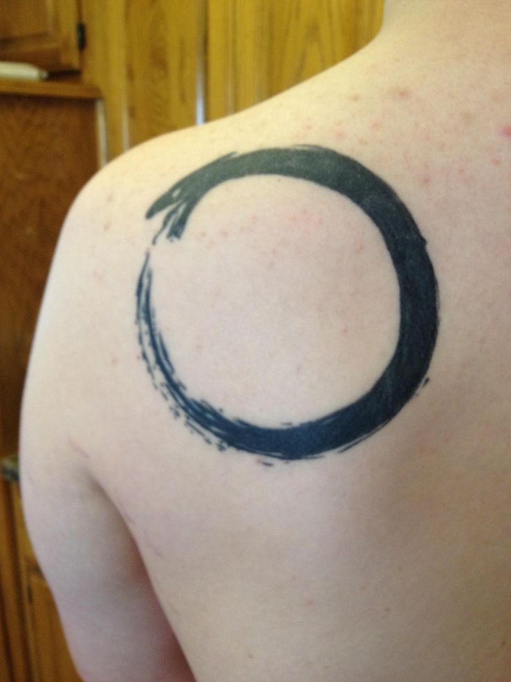 У владельца есть цитата, вытатуированная вдоль кривизны круга дзен. Цитата может быть изменена в соответствии с тем, что вам нравится. Его можно рассматривать как изображение жизни, а также его называют кругом единения.