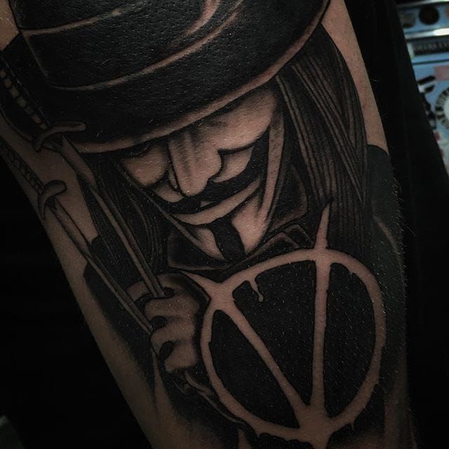 Татуировка в виде маски V означает вендетта — популярный выбор татуировки для тех, кто хочет продемонстрировать свою поддержку анархистскому движению. Маска стала культовым символом движения, и ее носили протестующие по всему миру.