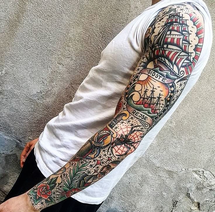 Татуировки старой школы обычно имеют смелые очертания, ограниченную цветовую палитру и классические мотивы, такие как якоря, сердца и девушки в стиле пин-ап.