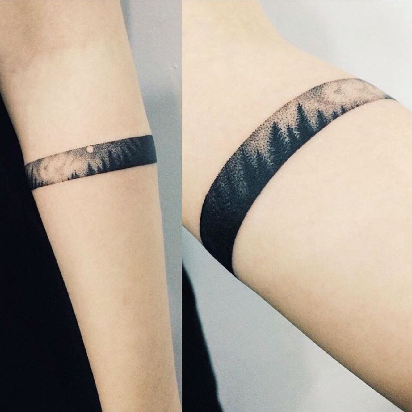 Линия дерева на этой татуировке, кажется, вырастает из повязки на руке. Это создает оптическую иллюзию, которая имитирует взгляд в густую лесистую долину, что делает эту простую татуировку с деревом потрясающей. Это идеальная татуировка на повязке для любителя природы.