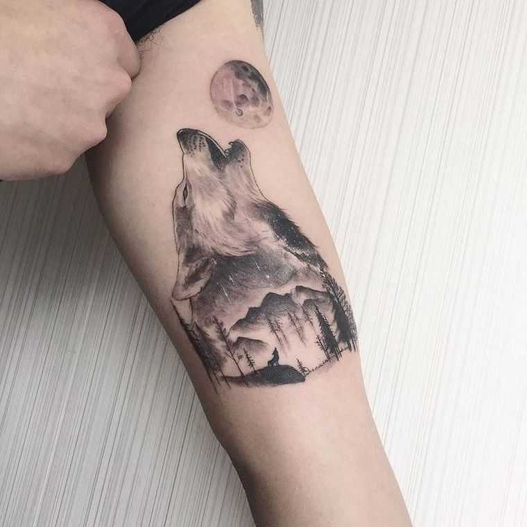 Эта татуировка начинается на предплечье и продолжается до запястья. Он полностью выполнен черными чернилами. Татуировка напоминает раскрашиваемую акварелью татуировку волка, которая выглядела бы сюрреалистично. Голова волка реалистична и имеет небольшую форму луны на лбу. Художнику удалось сделать это полностью черной тушью, с оттенками серого. Ниже головы течет река, окруженная землей и деревьями. Татуировка кажется темной, так как сейчас ночное время. Он излучает таинственную и мрачную атмосферу. Эта татуировка предназначена для тех, кто обладает загадочной личностью и любит, чтобы их оставили в покое.